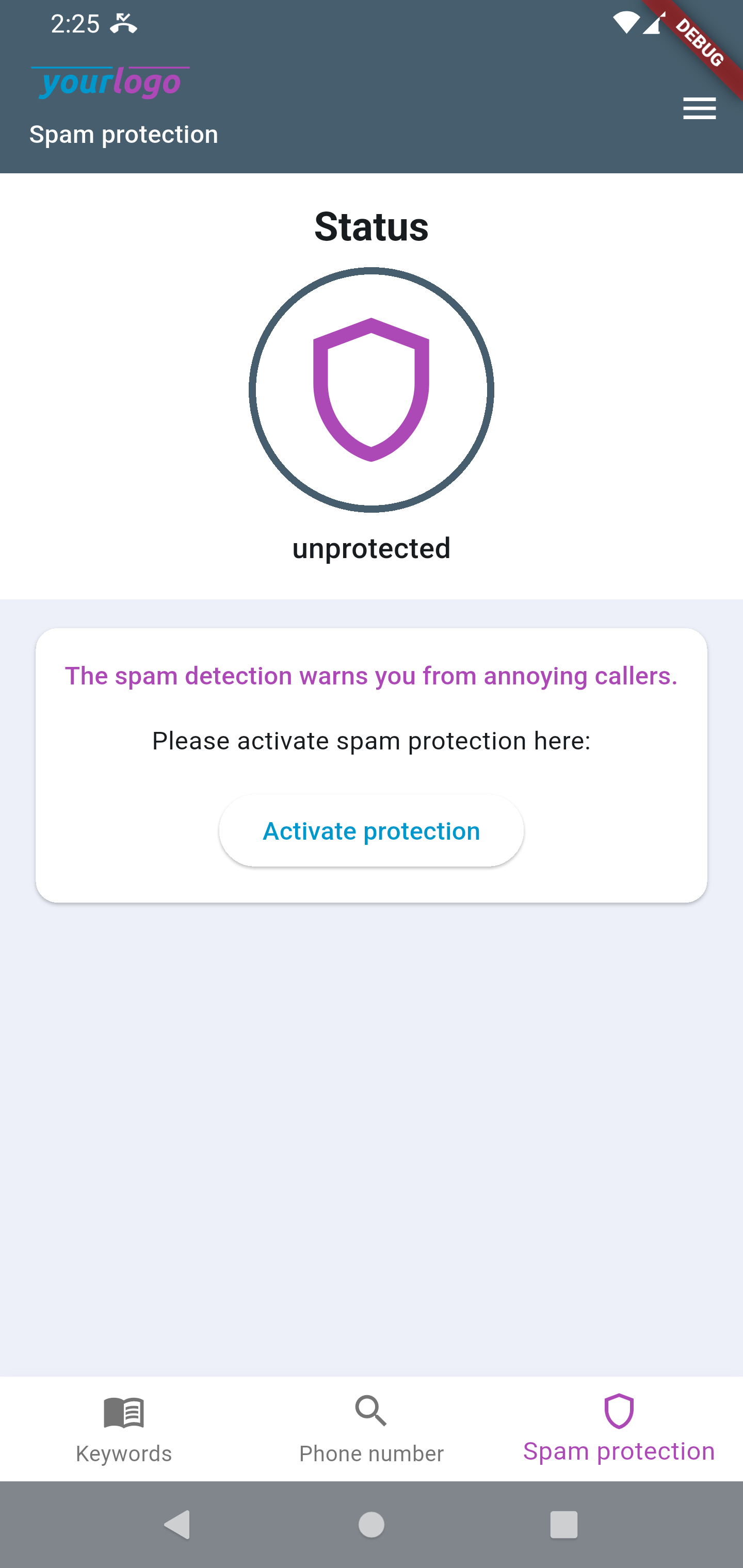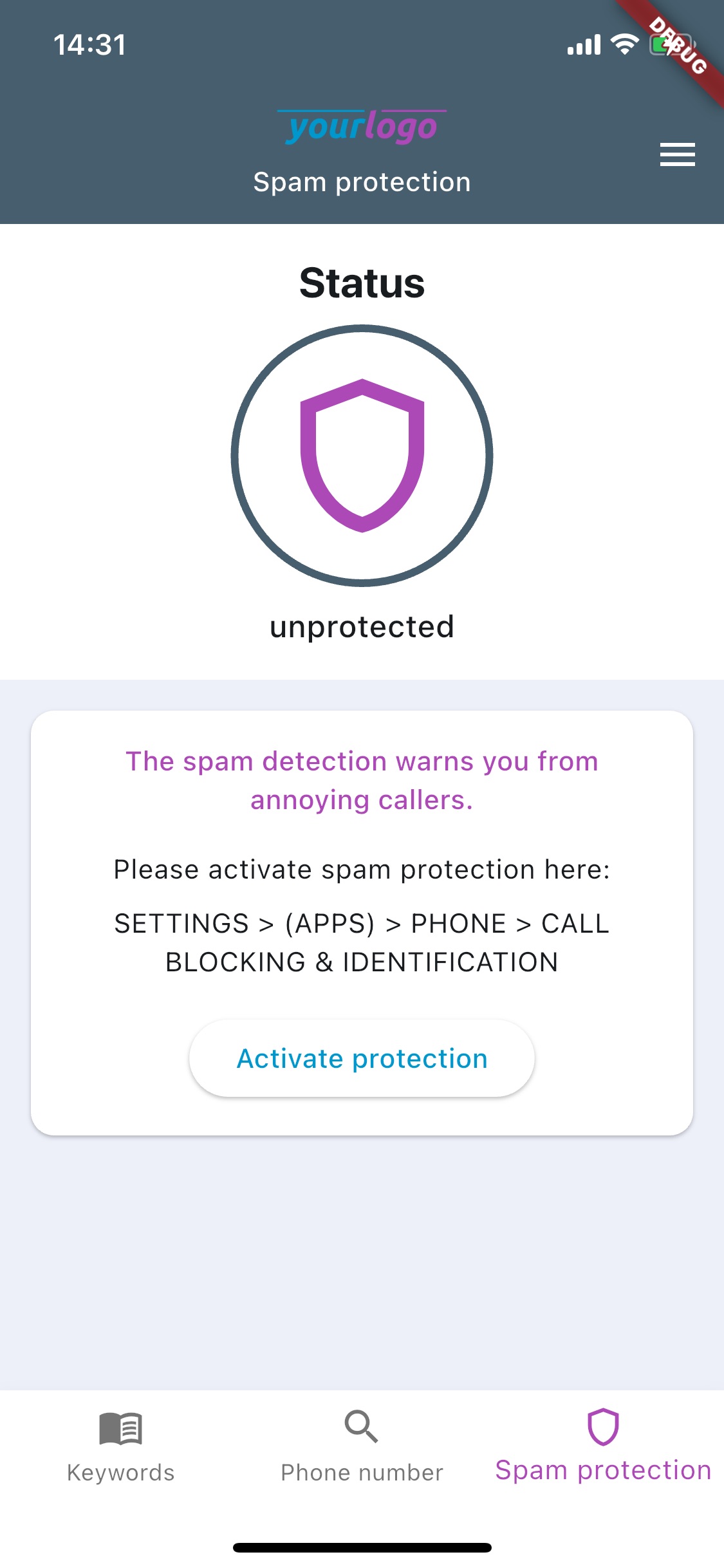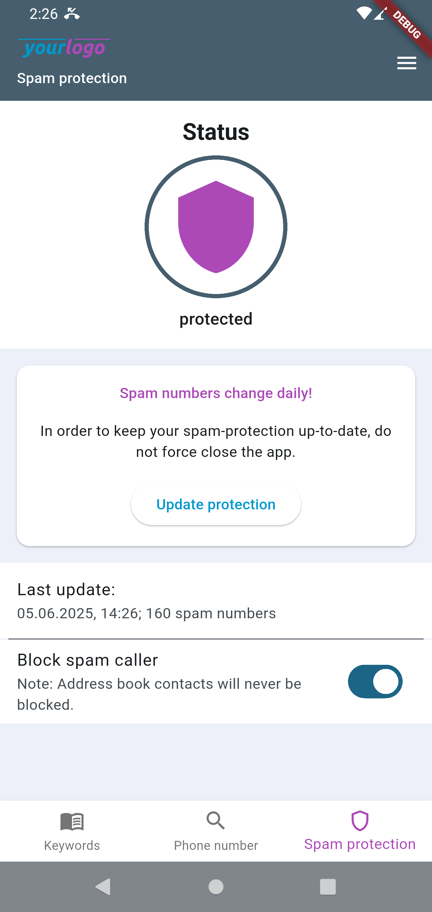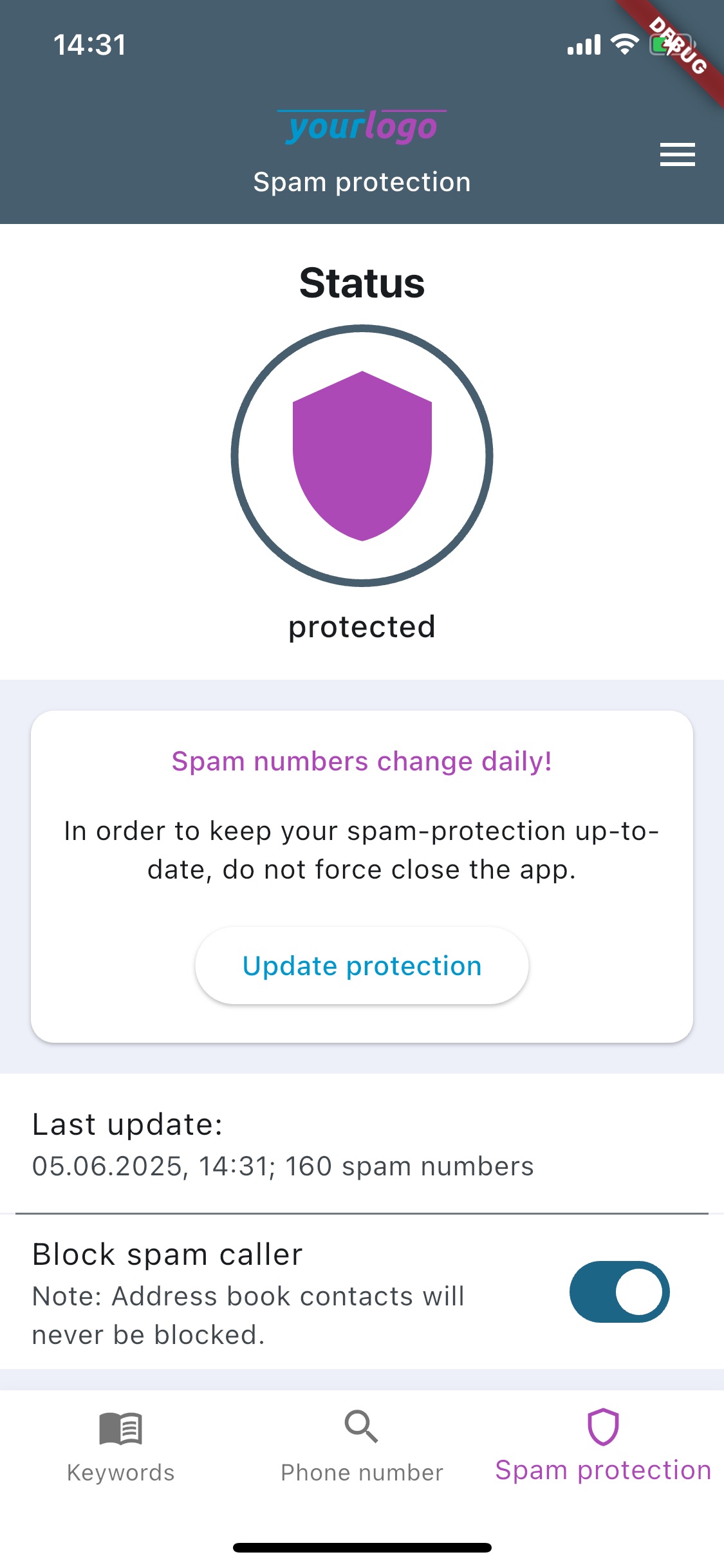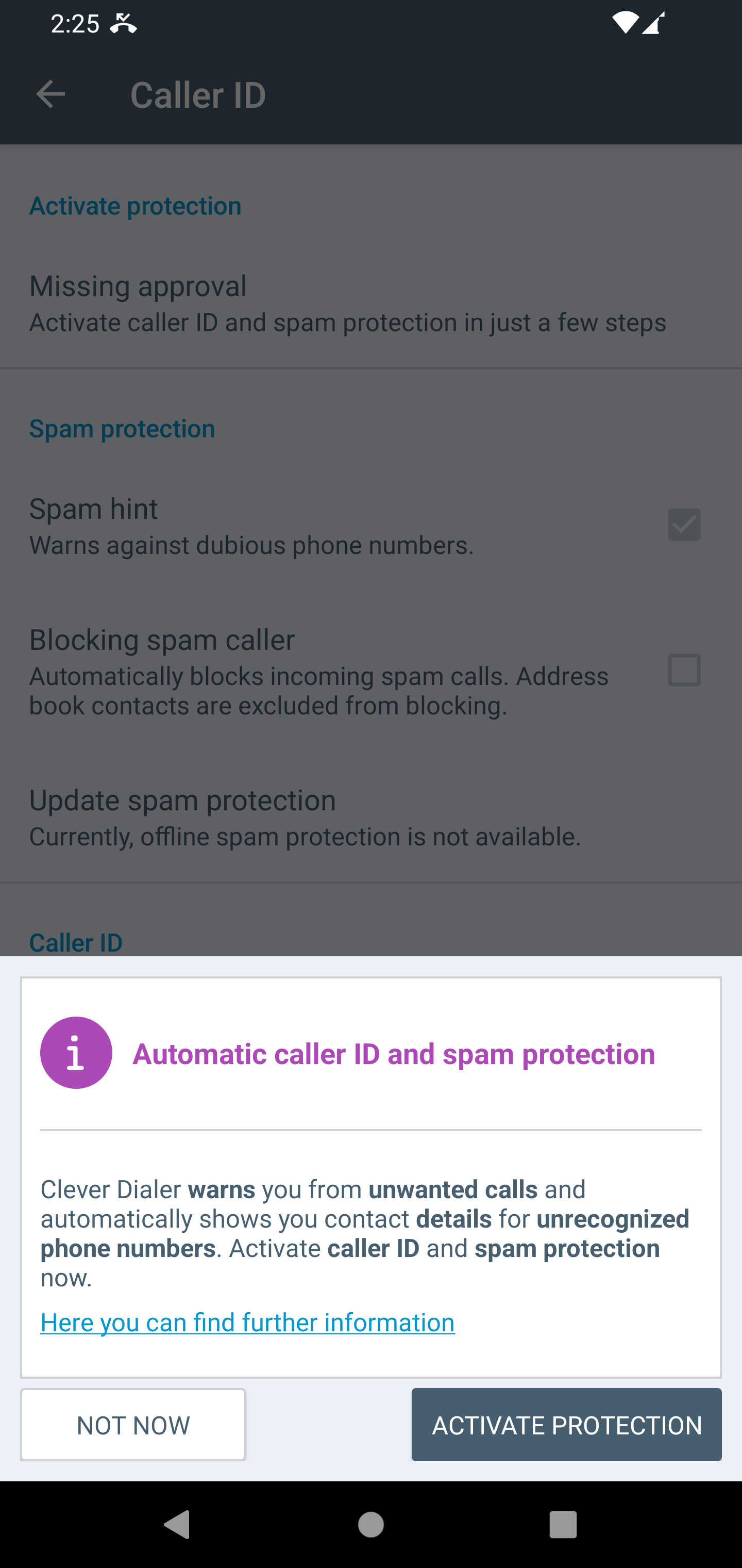 Beside the described common feature set, the app can extend its functionality even further - by providing our Clever Dialer core functionality: Caller identification and spam protection. If the partner wants to offer our spam protection to the app users, the app can be configured to contain a screen, which reflects the current status of this feature. It will enable the users to activate, check and update the spam protection.