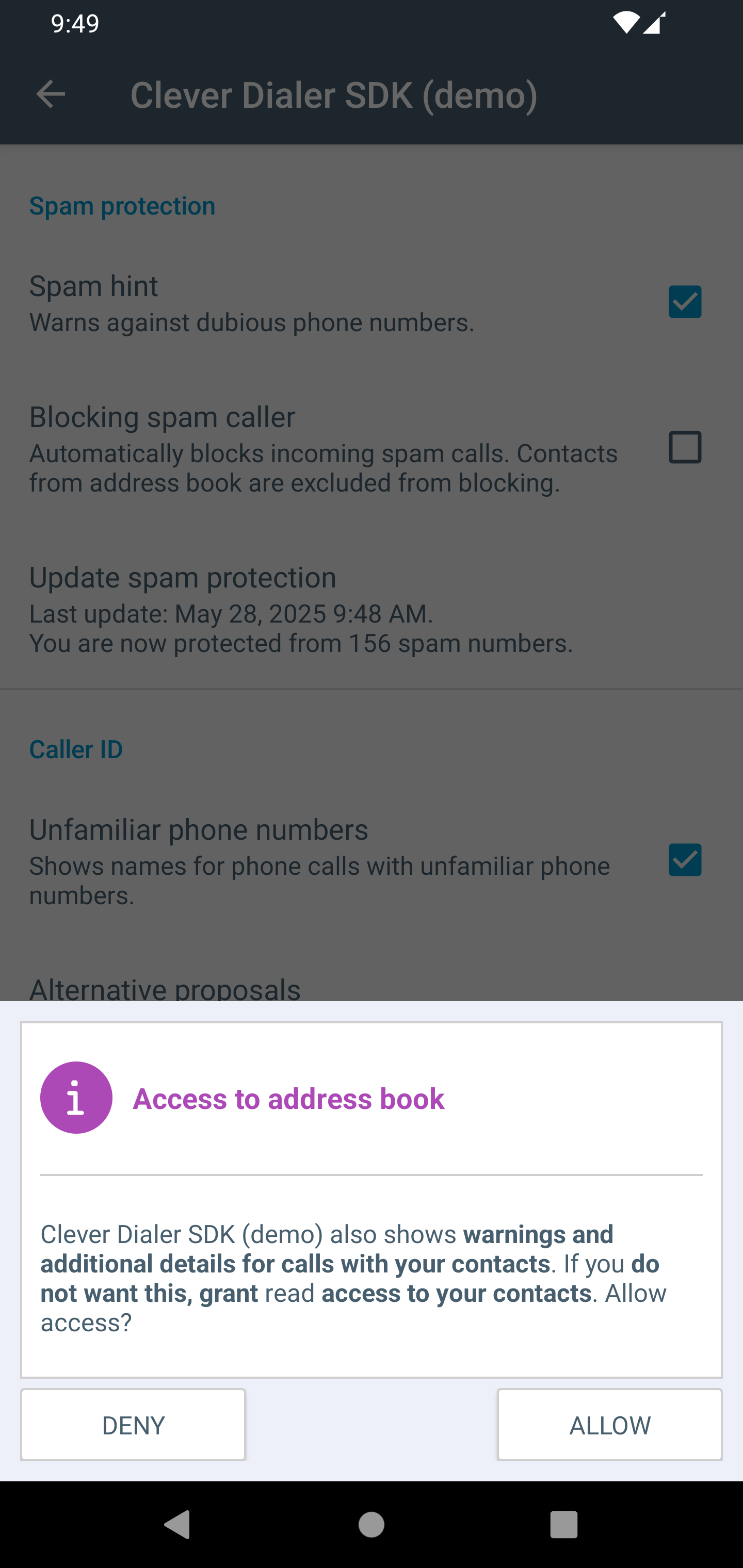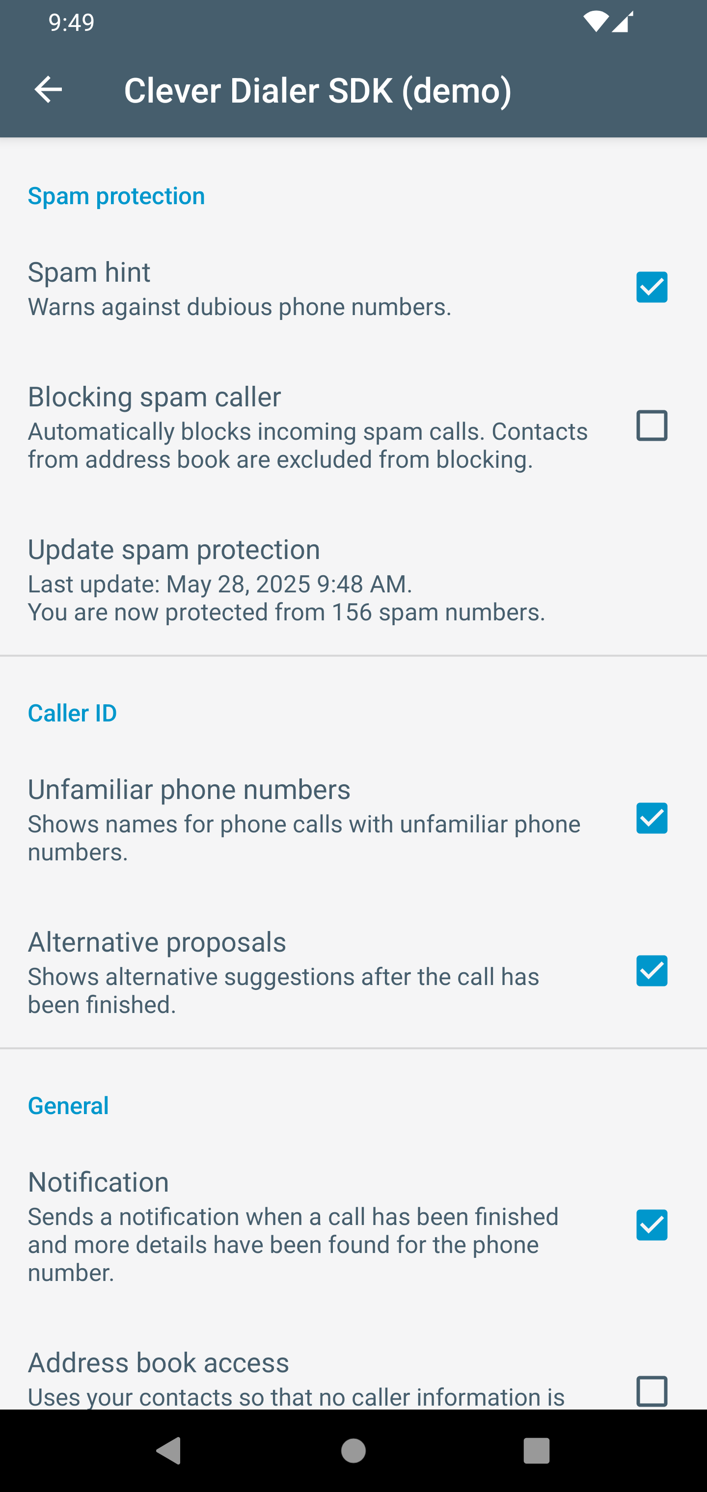 In the settings page, the user can enable the Clever Dialer SDK by accepting the usage and granting the required permissions, if he did not do so yet. As long as he did not activate the SDK, the settings will be disabled / inactive. As soon as the user activates the Clever Dialer SDK, it will start to show overlays with details about the phone number whenever a phone call takes place, and information is available.
